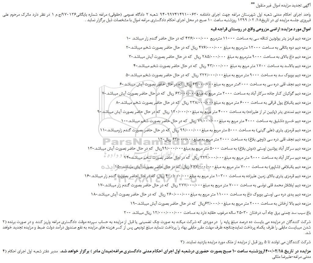 واحد اجرای احکام مدنی شعبه اول شهرستان مراغه جهت اجرای دادنامه 9409974149100630 شعبه 2 دادگاه عمومی (حقوقی) مراغه شماره بایگانی970136/ج.م 1 در نظر دارد ماترک مرحوم علی فیروزی جلسه مزایده ای در تاریخ18/ 02/ 1399 روزشنبه ساعت 10 صبح در محل اجرای احکام دادگستری مراغه اموال با مشخصات ذیل برگزار نماید .