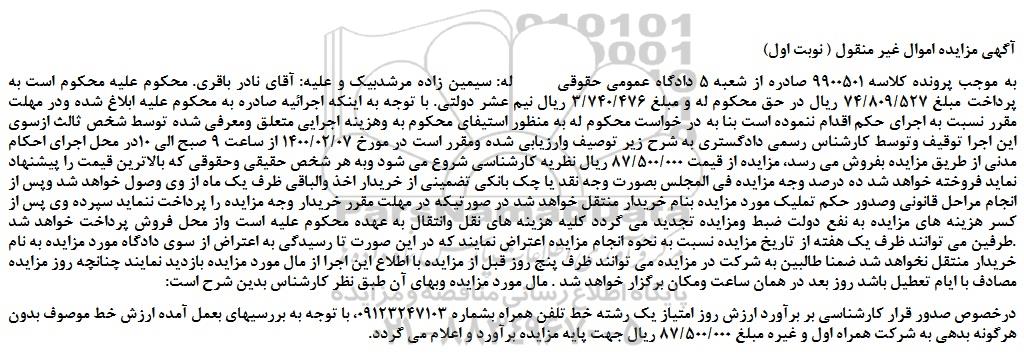 به موجب پرونده کلاسه 9900501 صادره از شعبه 5 دادگاه عمومی حقوقی        له: سیمین زاده مرشدبیک و علیه: آقای نادر باقری. محکوم علیه محکوم است به پرداخت مبلغ 74/809/527 ریال در حق محکوم له و مبلغ 3/740/476 ریال نیم عشر دولتی. با توجه به اینکه اجرائیه صادره به محکوم علیه ابلاغ شده ودر مهلت مقرر نسبت به اجرای حکم اقدام ننموده است بنا به در خواست محکوم له به منظور استیفای محکوم به وهزینه اجرایی متعلق ومعرفی شده توسط شخص ثالث ازسوی این اجرا توقیف وتوسط کارشناس رسمی دادگستری به شرح زیر توصیف وارزیابی شده ومقرر است در مورخ 1400/02/07 از ساعت 9 صبح الی 10در محل اجرای احکام مدنی از طریق مزایده بفروش می رسد، مزایده از قیمت 87/500/000 ریال نظریه کارشناسی شروع می شود وبه هر شخص حقیقی وحقوقی که بالاترین قیمت را پیشنهاد نماید فروخته خواهد شد ده درصد وجه مزایده فی المجلس بصورت وجه نقد یا چک بانکی تضمینی از خریدار اخذ والباقی ظرف یک ماه از وی وصول خواهد شد وپس از انجام مراحل قانونی وصدور حکم تملیک مورد مزایده بنام خریدار منتقل خواهد شد در صورتیکه در مهلت مقرر خریدار وجه مزایده را پرداخت ننماید سپرده وی پس از کسر هزینه های مزایده به نفع دولت ضبط ومزایده تجدید می گردد کلیه هزینه های نقل وانتقال به عهده محکوم علیه است واز محل فروش پرداخت خواهد شد .طرفین می توانند ظرف یک هفته از تاریخ مزایده نسبت به نحوه انجام مزایده اعتراض نمایند که در این صورت تا رسیدگی به اعتراض از سوی دادگاه مورد مزایده به نام خریدار منتقل نخواهد شد ضمنا طالبین به شرکت در مزایده می توانند ظرف پنج روز قبل از مزایده با اطلاع این اجرا از مال مورد مزایده بازدید نمایند چنانچه روز مزایده مصادف با ایام تعطیل باشد روز بعد در همان ساعت ومکان برگزار خواهد شد . مال مورد مزایده وبهای آن طبق نظر کارشناس بدین شرح است:
