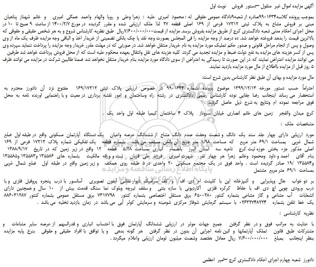 بموجب پرونده کلاسه9901634صادره از شعبه9دادگاه عمومی حقوقی  له : محمود  امیری  علیه  :  زهرا وعلی  و  رویا  والهام  واحمد  همگی  امیری    و  خانم  شهناز  پناهیان  مبنی  بر  فروش  مشاع  به  پلاک  ثبتی  17212  فرعی  از  169  اصلی  قطعه  27  لذا  ملک  ارزیابی  شده  و مقرر  گردیده  در مورخ 1400/2/7 از ساعت  9 صبح تا  10 در محل اجرای احکام مدنی شعبه دادگستری کرج از طریق مزایده بفروش برسد. مزایده از قیمت7/600/000/000ریال  طبق نظریه کارشناس شروع و به هر شخص حقیقی و حقوقی که بالاترین قیمت را بدهد فروخته خواهد شد. ده درصد از وجه مزایده را فی المجلس بصورت وجه نقد یا چک بانکی تضمینی از خریدار اخذ و الباقی وجه مزایده ظرف یک ماه از وی وصول و پس از انجام مراحل قانونی و صدور حکم تملیک مورد مزایده به نام خریدار منتقل خواهد شد. در صورتی که در مهلت مقرر خریدار وجه مزایده را پرداخت ننماید سپرده وی پس از کسر هزینه های مزایده به نفع دولت ضبط و مزایده تجدید می گردد. کلیه هزینه های نقل وانتقال بعهده محکوم علیه است که از محل فروش پرداخت خواهد شد طرفین    می توانند مزایده اعتراض نمایند که در این صورت تا رسیدگی به اعتراض از سوی دادگاه مورد مزایده بنام خریدار منتقل نخواهد شد ضمنا طالبین شرکت در مزایده می توانند ظرف 5 روز قبل از مزایده بااطلاع از مال مورد مزایده بازدید نمایند.