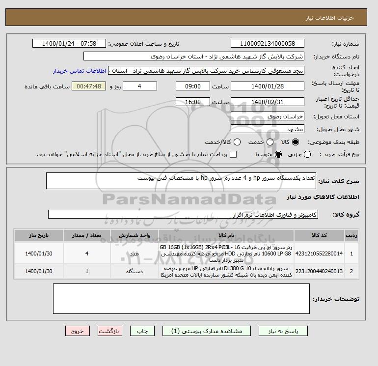 نام دستگاه خریدار:شرکت پالایش گاز شهید هاشمی نژاد - استان خراسان رضوی