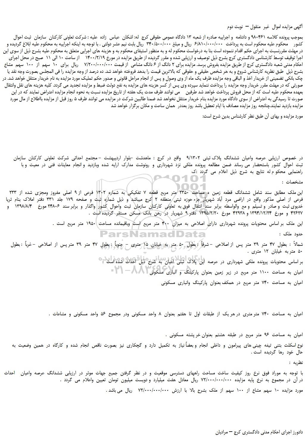 بموجب پرونده کلاسه 980461 و دادنامه و اجراییه صادره از شعبه 13 دادگاه عمومی حقوقی کرج له: اشکان عباس زاده علیه : شرکت تعاونی کارکنان سازمان ثبت احوال کشور محکوم علیه محکوم است به پرداخت 6/810/000/000 ریال و مبلغ 340/500/000 ریال بابت نیم عشر دولتی . با توجه به اینکه اجراییه به محکوم علیه ابلاغ گردیده و در مهلت مقررنسبت به اجرای حکم اقدام ننموده است بنا به درخواست محکوم له و به منظور استیفای محکوم به و هزینه های اجرایی متعلق به محکوم علیه بشرح ذیل از سوی این اجرا توقیف توسط کارشناسی دادگستری کرج بشرح ذیل توصیف و ارزیابی شده و مقرر گردیده از طریق مزایده در مورخ 1400/2/19 از ساعت 10 الی 11 صبح در محل اجرای احکام مدنی شعبه دادگستری کرج از طریق مزایده بفروش برسد. مزایده برای 2 دانگ از 6 دانگ مشاعی از قیمت 7/200/000/000 ریال برای 10 سهم از 100 سهم مشاع بشرح ذیل طبق نظریه کارشناس شروع و به هر شخص حقیقی و حقوقی که بالاترین قیمت را بدهد فروخته خواهد شد. ده درصد از وجه مزایده را فی المجلس بصورت وجه نقد یا چک بانکی تضمینی از خریدار اخذ و الباقی وجه مزایده ظرف یک ماه از وی وصول و پس از انجام مراحل قانونی و صدور حکم تملیک مورد مزایده به نام خریدار منتقل خواهد شد. در صورتی که در مهلت مقرر خریدار وجه مزایده را پرداخت ننماید سپرده وی پس از کسر هزینه های مزایده به نفع دولت ضبط و مزایده تجدید می گردد. کلیه هزینه های نقل وانتقال بعهده محکوم علیه است که از محل فروش پرداخت خواهد شد طرفین می توانند ظرف مدت یک هفته از تاریخ مزایده نسبت به نحوه انجام مزایده اعتراض نمایند که در این صورت تا رسیدگی به اعتراض از سوی دادگاه مورد مزایده بنام خریدار منتقل نخواهد شد ضمنا طالبین شرکت در مزایده می توانند ظرف 5 روز قبل از مزایده بااطلاع از مال مورد مزایده بازدید نمایند.چنانجه روز مزایده مصادف با ایام تعطیل باشد روز بعددر همان ساعت و مکان برگزار خواهد شد