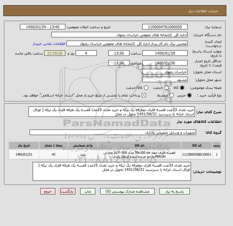 شرح کلی نیاز: خرید تعداد 33عدد قفسه فلزی دوطرفه یک تیکه و خرید تعداد 10عدد قفسه یک طرفه فلزی یک تیکه ( اوراق اسناد خزانه با سررسید 1401/06/21 تحویل در محل