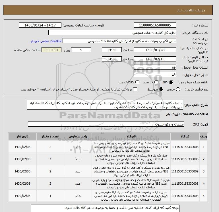 شرح کلی نیاز: مبلمان کتابخانه مرکزی قم عرضه کننده «شرکت لیوتاب» براساس توضیحات- توجه کنید که ایران کدها مشابه می باشد و حتما به توضیحات هر کالا دقت شود.