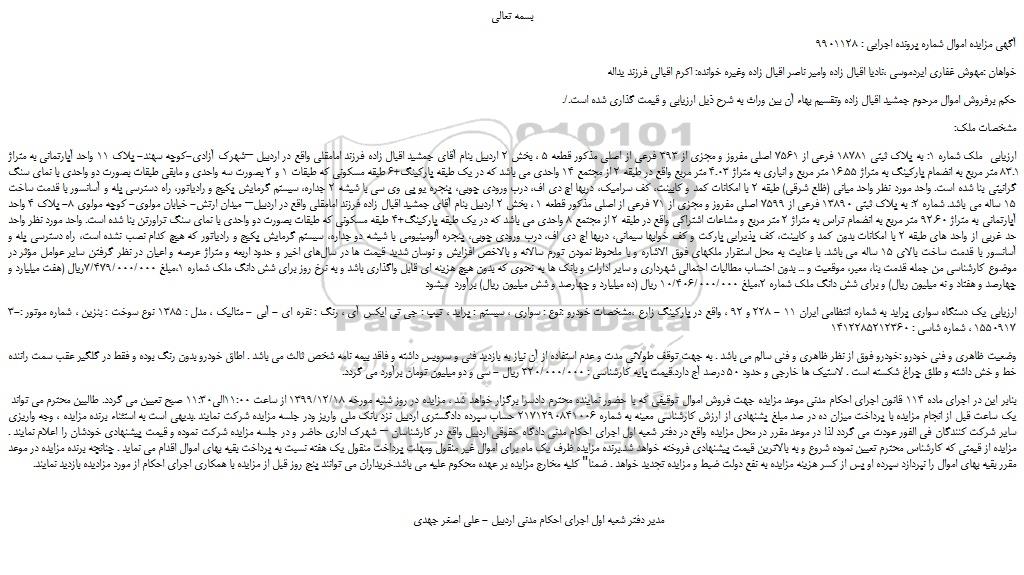 آگهی مزایده اموال شماره پرونده اجرایی : 9901128