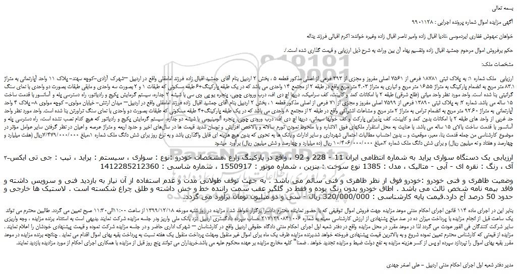 آگهی مزایده اموال شماره پرونده اجرایی : 9901128
