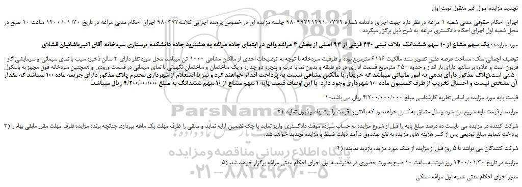 اجرای احکام حقوقی مدنی شعبه 1 مراغه در نظر دارد جهت اجرای دادنامه شماره 9809974149100374 جلسه مزایده ای در خصوص پرونده اجرایی کلاسه980372 اجرای احکام مدنی مراغه در تاریخ 30/ 01/ 1400 ساعت 10 صبح در محل شعبه اول اجرای احکام دادگستری مراغه به شرح ذیل برگزار میگردد.