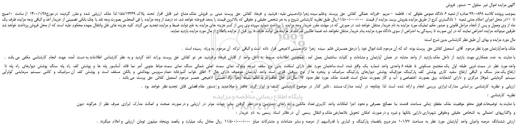 بموجب پرونده کلاسه 9900868 صادره از شعبه 6 دادگاه عمومی حقوقی  له :  فاطمه  - مریم  -فرزانه  همگی  کفاش  حق  پرست  وخانم سیده زهرا نژادحسینی علیه : فرشید  و  فرهاد  کفاش  حق  پرست  مبنی  بر  فروش  ملک مشاع  غیر  قابل  افراز  تحت  پلاک 155/12369 لذا  ملک  ارزیابی  شده  و مقرر  گردیده  در مورخ1400/1/28  از ساعت  10صبح تا  11در محل اجرای احکام مدنی شعبه  1 دادگستری کرج از طریق مزایده بفروش برسد. مزایده از قیمت  11/500/000/000ریال طبق نظریه کارشناس شروع و به هر شخص حقیقی و حقوقی که بالاترین قیمت را بدهد فروخته خواهد شد. ده درصد از وجه مزایده را فی المجلس بصورت وجه نقد یا چک بانکی تضمینی از خریدار اخذ و الباقی وجه مزایده ظرف یک ماه از وی وصول و پس از انجام مراحل قانونی و صدور حکم تملیک مورد مزایده به نام خریدار منتقل خواهد شد. در صورتی که در مهلت مقرر خریدار وجه مزایده را پرداخت ننماید سپرده وی پس از کسر هزینه های مزایده به نفع دولت ضبط و مزایده تجدید می گردد. کلیه هزینه های نقل وانتقال بعهده محکوم علیه است که از محل فروش پرداخت خواهد شد طرفین میتوانند مزایده اعتراض نمایند که در این صورت تا رسیدگی به اعتراض از سوی دادگاه مورد مزایده بنام خریدار منتقل نخواهد شد ضمنا طالبین شرکت در مزایده می توانند ظرف 5 روز قبل از مزایده بااطلاع از مال مورد مزایده بازدید نمایند.