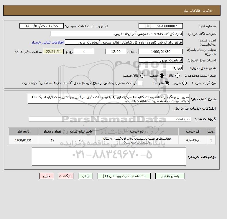 شرح کلی نیاز: سرویس و نگهداری تاسیسات کتابخانه مرکزی ارومیه با توضیحات دقیق در فایل پیوستی-مدت قرارداد یکساله خواهد بود-تسویه به صورت ماهانه خواهد بود