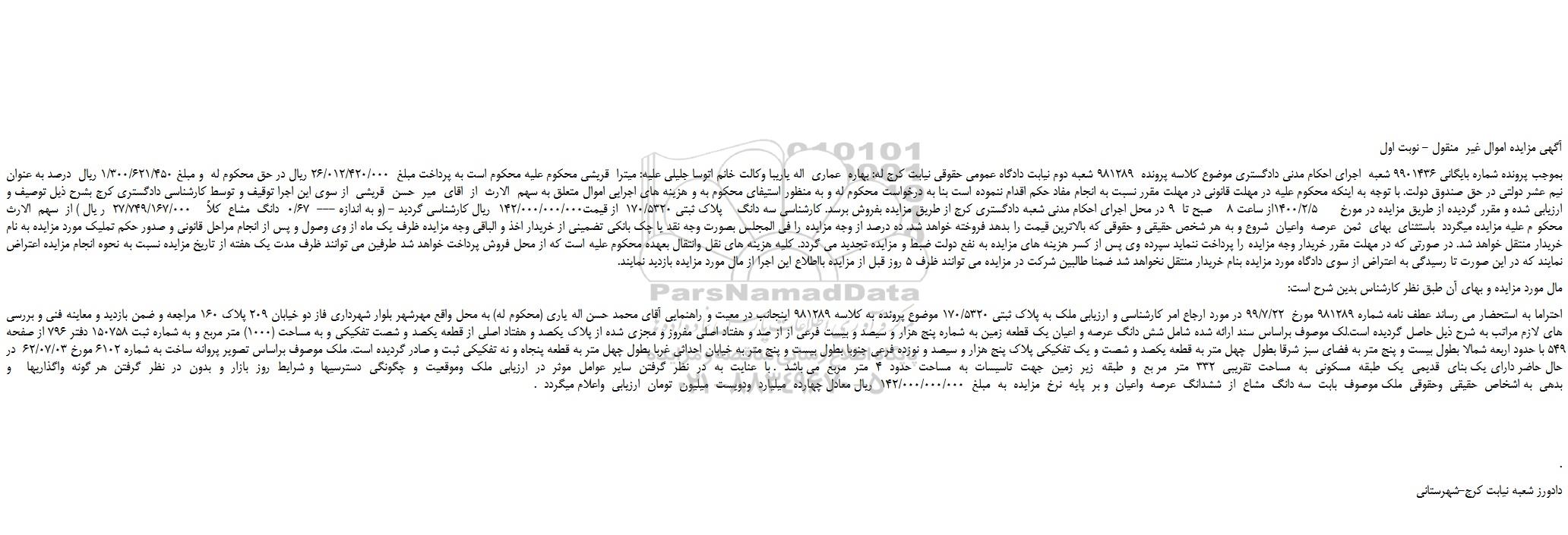 بموجب پرونده شماره بایگانی 9901436 شعبه  اجرای احکام مدنی دادگستری موضوع کلاسه پرونده  981289 شعبه دوم نیابت دادگاه عمومی حقوقی نیابت کرج له: بهاره  عماری  اله یاریبا وکالت خانم اتوسا جلیلی علیه: میترا  قریشی محکوم علیه محکوم است به پرداخت مبلغ  26/012/420/000 ریال در حق محکوم له  و مبلغ 1/300/621/450 ریال  درصد به عنوان نیم عشر دولتی در حق صندوق دولت. با توجه به اینکه محکوم علیه در مهلت قانونی در مهلت مقرر نسبت به انجام مفاد حکم اقدام ننموده است بنا به درخواست محکوم له و به منظور استیفای محکوم به و هزینه های اجرایی اموال متعلق به سهم  الارث  از  اقای  میر  حسن  قریشی  از سوی این اجرا توقیف و توسط کارشناسی دادگستری کرج بشرح ذیل توصیف و ارزیابی شده و مقرر گردیده از طریق مزایده در مورخ      1400/2/5از ساعت 8    صبح تا  9 در محل اجرای احکام مدنی شعبه دادگستری کرج از طریق مزایده بفروش برسد. کارشناسی سه دانگ    پلاک ثبتی 170/5320  از قیمت142/000/000/000  ریال کارشناسی گردید - (و به اندازه ---  0/67  دانگ  مشاع  کلاً    27/749/167/000  ر یال ) از  سهم  الارث محکو م علیه مزایده میگردد  باستثنای  بهای  ثمن  عرصه  واعیان  شروع و به هر شخص حقیقی و حقوقی که بالاترین قیمت را بدهد فروخته خواهد شد. ده درصد از وجه مزایده را فی المجلس بصورت وجه نقد یا چک بانکی تضمینی از خریدار اخذ و الباقی وجه مزایده ظرف یک ماه از وی وصول و پس از انجام مراحل قانونی و صدور حکم تملیک مورد مزایده به نام خریدار منتقل خواهد شد. در صورتی که در مهلت مقرر خریدار وجه مزایده را پرداخت ننماید سپرده وی پس از کسر هزینه های مزایده به نفع دولت ضبط و مزایده تجدید می گردد. کلیه هزینه های نقل وانتقال بعهده محکوم علیه است که از محل فروش پرداخت خواهد شد طرفین می توانند ظرف مدت یک هفته از تاریخ مزایده نسبت به نحوه انجام مزایده اعتراض نمایند که در این صورت تا رسیدگی به اعتراض از سوی دادگاه مورد مزایده بنام خریدار منتقل نخواهد شد ضمنا طالبین شرکت در مزایده می توانند ظرف 5 روز قبل از مزایده بااطلاع این اجرا از مال مورد مزایده بازدید نمایند.