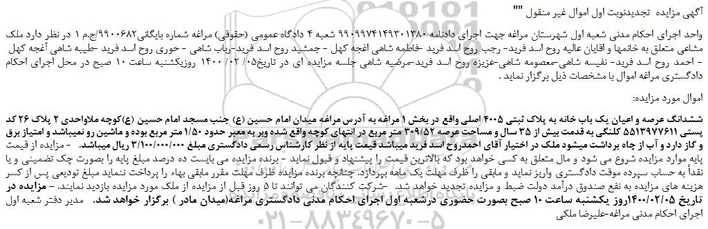 واحد اجرای احکام مدنی شعبه اول شهرستان مراغه جهت اجرای دادنامه 9909974149301380 شعبه 4 دادگاه عمومی (حقوقی) مراغه شماره بایگانی9900682/ج.م 1 در نظر دارد ملک مشاعی متعلق به خانمها و اقایان عالیه روح اسد فرید- رجب روح اسد فرید -فاطمه شاهی اغجه کهل - جمشید روح اسد فرید-رباب شاهی - حوری روح اسد فرید -طیبه شاهی آغجه کهل - احمد روح اسد فرید- نفیسه شاهی-معصومه شاهی-عزیزه روح اسد فرید-مرضیه شاهی جلسه مزایده ای در تاریخ05/ 02/ 1400 روزیکشنبه ساعت 10 صبح در محل اجرای احکام دادگستری مراغه اموال با مشخصات ذیل برگزار نماید .