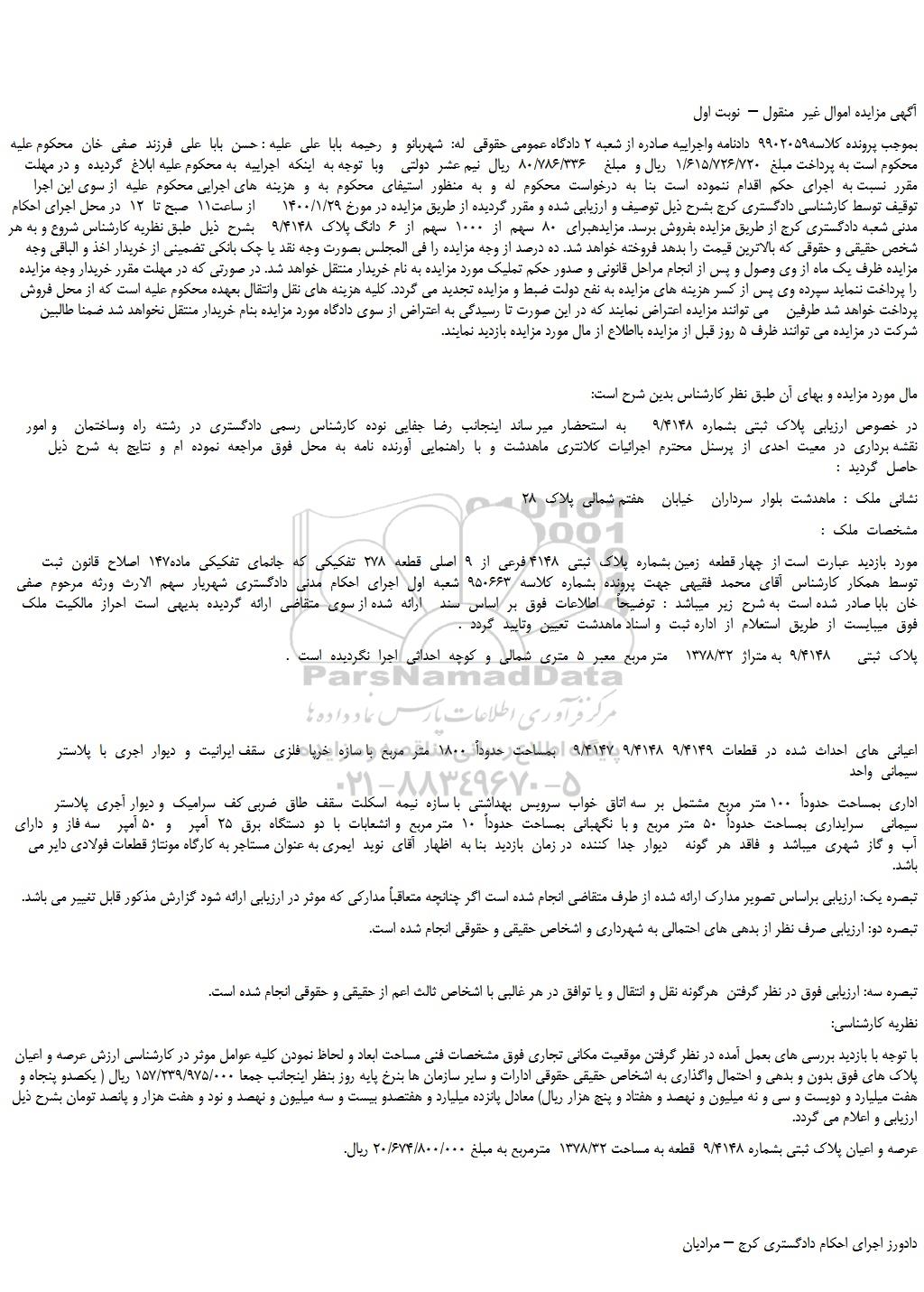 بموجب پرونده کلاسه9902059 دادنامه واجراییه صادره از شعبه 2 دادگاه عمومی حقوقی له: شهربانو و رحیمه بابا علی علیه : حسن بابا علی فرزند صفی خان محکوم علیه محکوم است به پرداخت مبلغ 1/615/726/720 ریال و مبلغ 80/786/336 ریال نیم عشر دولتی وبا توجه به اینکه اجراییه به محکوم علیه ابلاغ گردیده و در مهلت مقرر نسبت به اجرای حکم اقدام ننموده است بنا به درخواست محکوم له و به منظور استیفای محکوم به و هزینه های اجرایی محکوم علیه از سوی این اجرا توقیف توسط کارشناسی دادگستری کرج بشرح ذیل توصیف و ارزیابی شده و مقرر گردیده از طریق مزایده در مورخ 1400/1/29 از ساعت11 صبح تا 12 در محل اجرای احکام مدنی شعبه دادگستری کرج از طریق مزایده بفروش برسد. مزایدهبرای 80 سهم از 1000 سهم از 6 دانگ پلاک 9/4148 بشرح ذیل طبق نظریه کارشناس شروع و به هر شخص حقیقی و حقوقی که بالاترین قیمت را بدهد فروخته خواهد شد. ده درصد از وجه مزایده را فی المجلس بصورت وجه نقد یا چک بانکی تضمینی از خریدار اخذ و الباقی وجه مزایده ظرف یک ماه از وی وصول و پس از انجام مراحل قانونی و صدور حکم تملیک مورد مزایده به نام خریدار منتقل خواهد شد. در صورتی که در مهلت مقرر خریدار وجه مزایده را پرداخت ننماید سپرده وی پس از کسر هزینه های مزایده به نفع دولت ضبط و مزایده تجدید می گردد. کلیه هزینه های نقل وانتقال بعهده محکوم علیه است که از محل فروش پرداخت خواهد شد طرفین می توانند مزایده اعتراض نمایند که در این صورت تا رسیدگی به اعتراض از سوی دادگاه مورد مزایده بنام خریدار منتقل نخواهد شد ضمنا طالبین شرکت در مزایده می توانند ظرف 5 روز قبل از مزایده بااطلاع از مال مورد مزایده بازدید نمایند.
