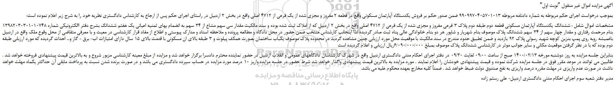 بموجب درخواست اجرای حکم مربوطه به شماره دادنامه مربوطه 9909970405701013 ضمن صدور حکم بر فروش یکدستگاه آپارتمان مسکونی واقع در قطعه 2 مفروز و مجزی شده از یک فرعی از 4712 اصلی واقع در بخش 2 اردبیل در راستای اجرای حکم پس از ارجاع به کارشناس دادگستری نظریه خود را به شرح زیر اعلام نموده است: