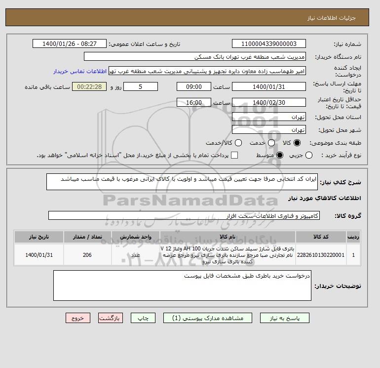 استعلام بها و موضوع استعلام استعلام ایران کد انتخابی صرفا جهت تعیین قیمت میباشد و اولویت با کالای ایرانی مرغوب با قیمت مناسب میباشد به اطلاع کلیه شرکتها و افراد متخصص واجد شرایط میرساند، آگهی گذار در نظر دارد از طریق استعلام بها، نسبت به انتخاب و دریافت پیشنهادات اقدام نماید. این استعلام با کد آگهی ثبت شده در سامانه خبرگزاری پارس نماد : 3327421 منتشر شده است. مشخصات استعلام : تاریخ شروع استعلام: 1400/01/26 آخرین مهلت ارسال پیشنهاد قیمت : 1400/01/31 و محل اجرای پروژه : استان تهران میباشد. استعلام قیمت مورد درخواست : استعلام ایران کد انتخابی صرفا جهت تعیین قیمت میباشد و اولویت با کالای ایرانی مرغوب با قیمت مناسب میباشد با دستهبندیهای تخصصی و گروه های مرتبط : منابع تغذیه, تجهیزات برق و الکترونیک, استعلام اطلاع رسانی میگردد. شرایط شرکت در استعلام آنلاین : ابتدا ثبت نام در سامانه استعلام پارس نماد و تکمیل مدارک موردنیاز و بارگذاری در سامانه رعایت تمامی ضوابط و الزامات مندرج در اسناد استعلام است.