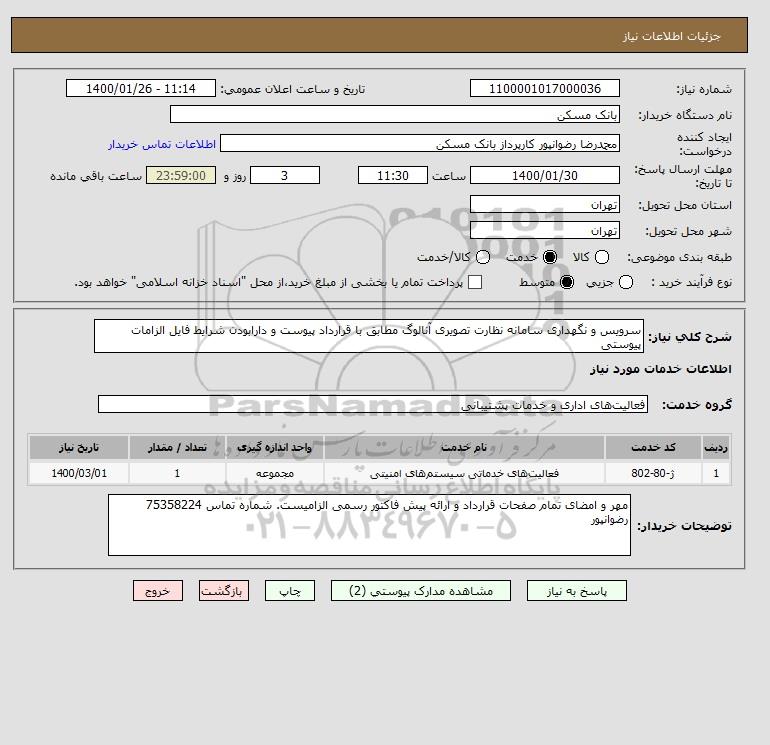 شرح کلی نیاز: سرویس و نگهداری سامانه نظارت تصویری آنالوگ مطابق با قرارداد پیوست و دارابودن شرایط فایل الزامات پیوستی