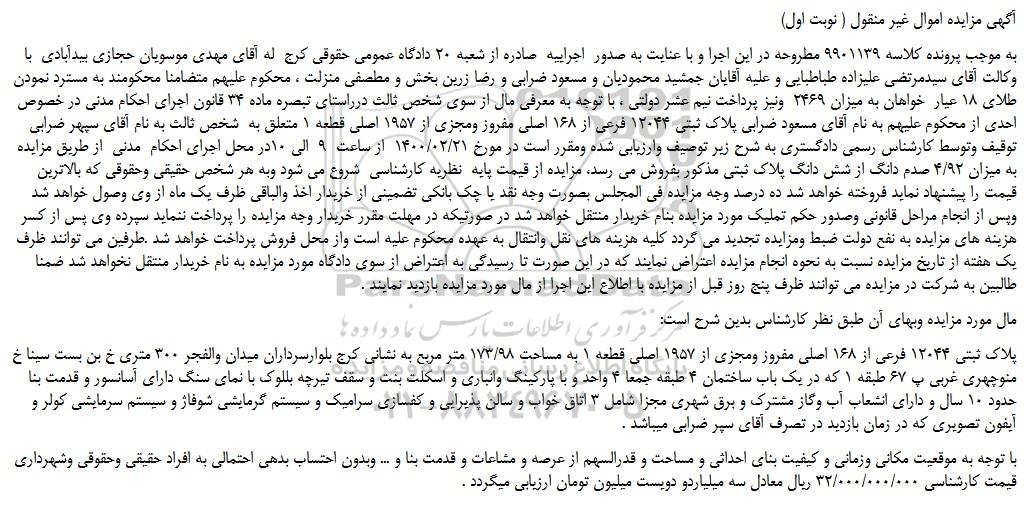 به موجب پرونده کلاسه 9901139 مطروحه در این اجرا و با عنایت به صدور اجراییه صادره از شعبه 20 دادگاه عمومی حقوقی کرج له آقای مهدی موسویان حجازی بیدآبادی با وکالت آقای سیدمرتضی علیزاده طباطبایی و علیه آقایان جمشید محمودیان و مسعود ضرابی و رضا زرین بخش و مطصفی منزلت ، محکوم علیهم متضامنا محکومند به مسترد نمودن طلای 18 عیار خواهان به میزان 2469 ونیز پرداخت نیم عشر دولتی ، با توجه به معرفی مال از سوی شخص ثالث درراستای تبصره ماده 34 قانون اجرای احکام مدنی در خصوص احدی از محکوم علیهم به نام آقای مسعود ضرابی پلاک ثبتی 12044 فرعی از 168 اصلی مفروز ومجزی از 1957 اصلی قطعه 1 متعلق به شخص ثالث به نام آقای سپهر ضرابی توقیف وتوسط کارشناس رسمی دادگستری به شرح زیر توصیف وارزیابی شده ومقرر است در مورخ 1400/02/21 از ساعت 9 الی 10در محل اجرای احکام مدنی از طریق مزایده به میزان 4/92 صدم دانگ از شش دانگ پلاک ثبتی مذکور بفروش می رسد، مزایده از قیمت پایه نظریه کارشناسی شروع می شود وبه هر شخص حقیقی وحقوقی که بالاترین قیمت را پیشنهاد نماید فروخته خواهد شد ده درصد وجه مزایده فی المجلس بصورت وجه نقد یا چک بانکی تضمینی از خریدار اخذ والباقی ظرف یک ماه از وی وصول خواهد شد وپس از انجام مراحل قانونی وصدور حکم تملیک مورد مزایده بنام خریدار منتقل خواهد شد در صورتیکه در مهلت مقرر خریدار وجه مزایده را پرداخت ننماید سپرده وی پس از کسر هزینه های مزایده به نفع دولت ضبط ومزایده تجدید می گردد کلیه هزینه های نقل وانتقال به عهده محکوم علیه است واز محل فروش پرداخت خواهد شد .طرفین می توانند ظرف یک هفته از تاریخ مزایده نسبت به نحوه انجام مزایده اعتراض نمایند که در این صورت تا رسیدگی به اعتراض از سوی دادگاه مورد مزایده به نام خریدار منتقل نخواهد شد ضمنا طالبین به شرکت در مزایده می توانند ظرف پنج روز قبل از مزایده با اطلاع این اجرا از مال مورد مزایده بازدید نمایند .