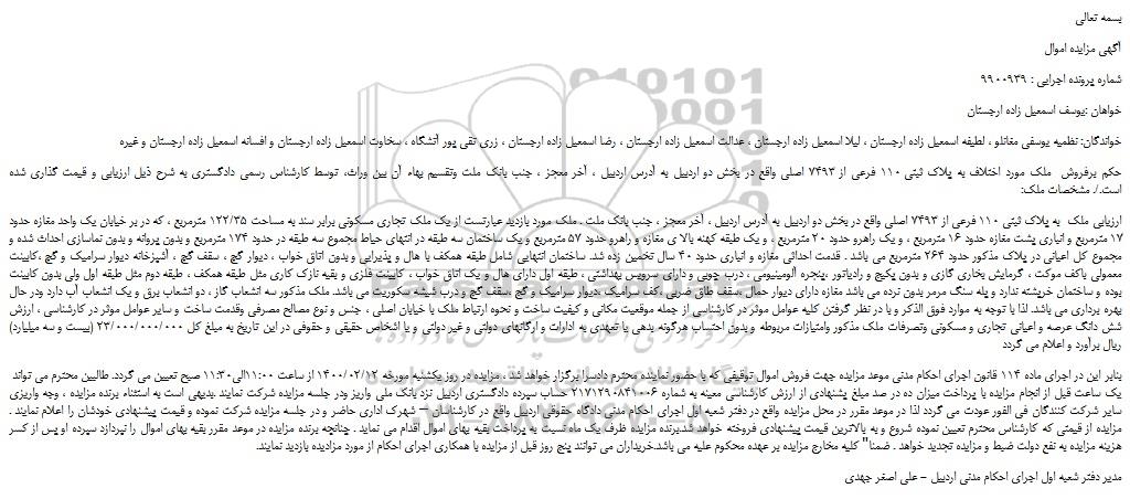 حکم برفروش  ملک مورد اختلاف به پلاک ثبتی 110 فرعی از 7493 اصلی واقع در بخش دو اردبیل به آدرس اردبیل ، آخر معجز ، جنب بانک ملت وتقسیم بهاء آن بین وراث، توسط کارشناس رسمی دادگستری به شرح ذیل ارزیابی و قیمت گذاری شده است./. مشخصات ملک: