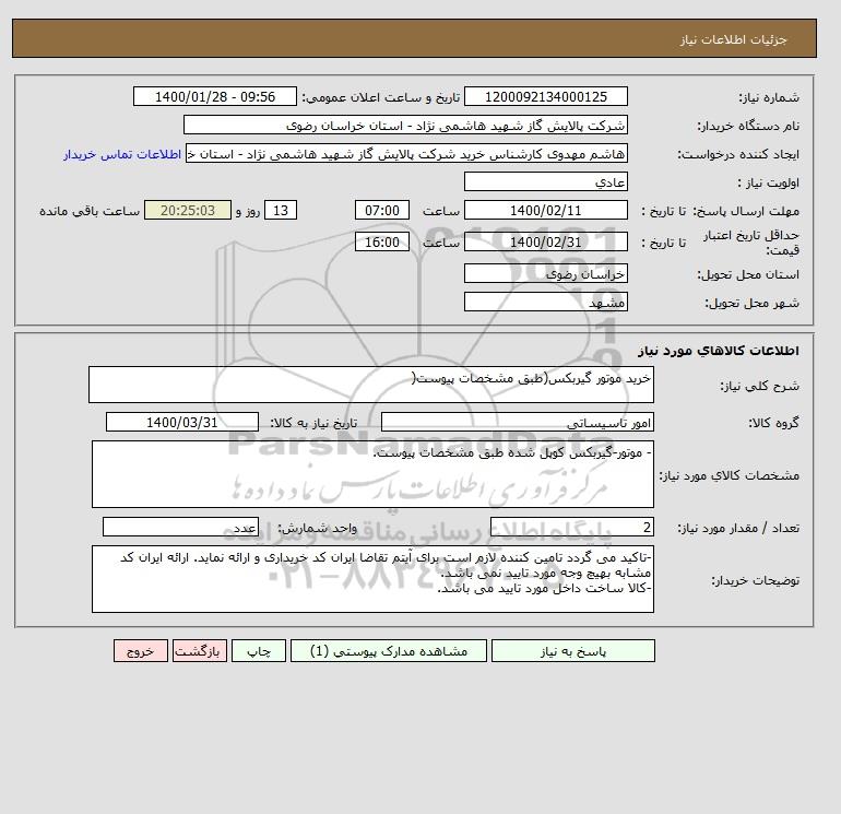 نام دستگاه خریدار:شرکت پالایش گاز شهید هاشمی نژاد - استان خراسان رضوی