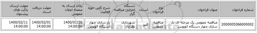 | 2000005366000002 | مناقصه عمومی یک مرحله ای باز سازی چهار دستگاه اتوبوس | مناقصه عمومی | البرز | شهرداری نظرآباد | باز سازی چهار دستگاه اتوبوس | 1400/01/26 14:00:00 | 1400/02/01 14:00:00 | 1400/02/11 14:00:00 |