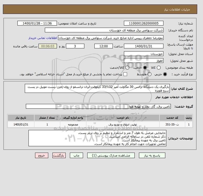 شرح کلی نیاز: بارگیری یک دستگاه ترانس 30 مگاولت آمپر 33/132 کیلوولت ایران ترانسفو از روی زمین ،پست موبیل در پست سرو هویزه