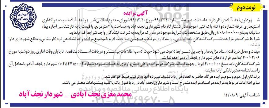 شهرداری نجف آباد در نظر دارد نسبت به واگذاری استیجاری غرفه شماره دو (کله پاک کنی) موجود در کشتارگاه دام شهرداری نجف آباد، به مساحت 48 متر مربع با قیمت پایه کارشناسی اجاره بها سالیانه به مبلغ 1.080.000.000 ریال طبق مشخصات و شرایط موجود در مدارک مزایده به شرکت کنندگان واجد شرایط اقدام نماید.