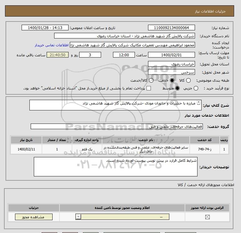 شرح کلی نیاز: مبارزه با حشرات و جانوران موذی -شرکت پالایش گاز شهید هاشمی نژاد