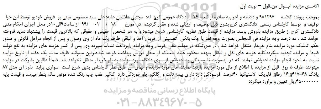 بموجب پرونده کلاسه    981297 و دادنامه و اجراییه صادره از شعبه 16    دادگاه عمومی کرج  له:  مجتبی هلالیان علیه: علی سید معصومی مبنی بر  فروش خودرو توسط این جرا توقیف و  توسط کارشناس رسمی  دادگستری کرج بشرح ذیل توصیف و ارزیابی شده و مقرر گردیده  در  مورخ      18  /    02    /99  از ساعت9الی10در محل اجرای احکام مدنی دادگستری کرج از طریق مزایده بفروش برسد. مزایده از قیمت طبق نظریه کارشناسی شروع میشود و به هر شخص  حقیقی و حقوقی که بالاترین قیمت را پیشنهاد نماید فروخته خواهد شد . ده درصد وجه مزایده فی المجلس بصورت وجه نقد یا چک بانکی  تضمینی از خریدار اخذ و الباقی ظرف یک ماه از وی وصول و پس از انجام مراحل قانونی و صدور حکم تملیک مورد مزایده بنام خریدار منتقل خواهد شد . در صورتیکه در مهلت مقرر خریدار وجه مزایده راپرداخت ننماید سپرده وی پس از کسر هزینه های مزایده به نفع دولت ضبط و مزایده تجدید میگردد.کلیه هزینه های نقل و انتقال بعهده محکوم علیه است.که از محل فروش پرداخت خواهد شد.طرفین میتوانند ظرف مدت یک هفته از تاریخ مزایده نسبت به نحوه انجام مزایده اعتراض نمایند که در اینصورت تا رسیدگی به اعتراض از سوی دادگاه مورد مزایده به نام خریدار منتقل نخواهد شد. ضمناً طالبین بشرکت در مزایده میتوانند ظرف 5 روز  قبل از مزایده با اطلاع از مال مورد مزایده بازدید نمایند. مال مورد مزایده و بهای آن طبق نظر کارشناس بدین شرح است  سواری پراید  نقره ای مدل 87 پلاک 68-417ق16 رطاق فابریک  لاستیکها 40درصد  فرسودگی دارد دارای بیمه ثالث و  گلگیر جلو خوردگی دارد  گلگیر عقب چپ رنگ شده موتور سالم بنظر میرسد و قیمت پایه 450000000ریال تعیین و براورد میگردد