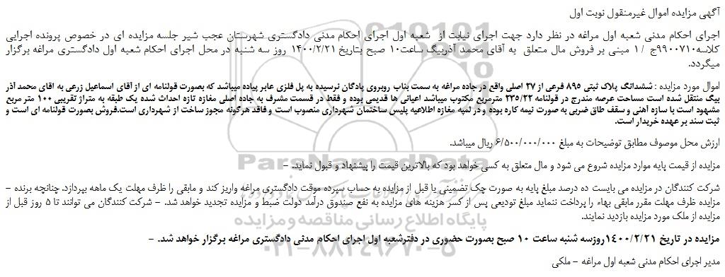 اجرای احکام مدنی شعبه اول مراغه در نظر دارد جهت اجرای نیابت از شعبه اول اجرای احکام مدنی دادگستری شهرستان عجب شیر جلسه مزایده ای در خصوص پرونده اجرایی کلاسه9900710ج / 1 مبنی بر فروش مال متعلق به آقای محمد آذربیگ ساعت10 صبح بتاریخ 1400/2/21 روز سه شنبه در محل اجرای احکام شعبه اول دادگستری مراغه برگزار میگردد.