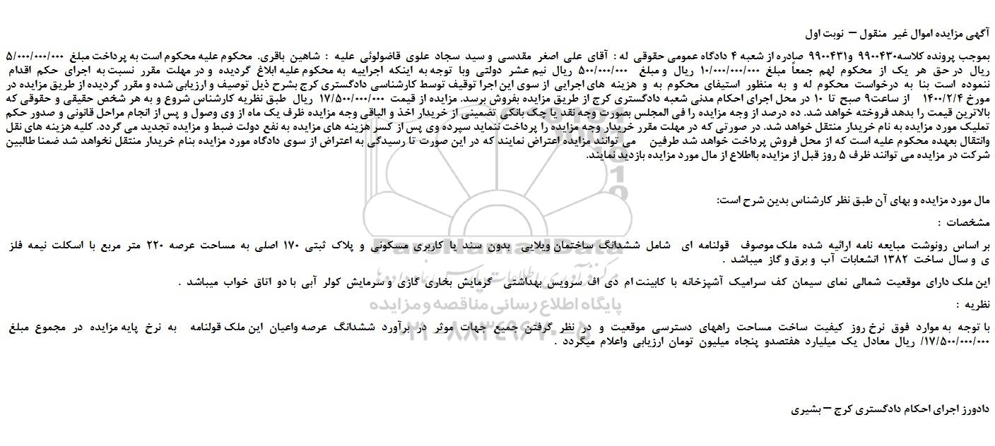 بموجب پرونده کلاسه9900430 و9900431 صادره از شعبه 4 دادگاه عمومی حقوقی له : آقای علی اصغر مقدسی و سید سجاد علوی قاضولوئی علیه : شاهین باقری. محکوم علیه محکوم است به پرداخت مبلغ 5/000/000/000 ریال در حق هر یک از محکوم لهم جمعاً مبلغ 10/000/000/000 ریال و مبلغ 500/000/000 ریال نیم عشر دولتی وبا توجه به اینکه اجراییه به محکوم علیه ابلاغ گردیده و در مهلت مقرر نسبت به اجرای حکم اقدام ننموده است بنا به درخواست محکوم له و به منظور استیفای محکوم به و هزینه های اجرایی از سوی این اجرا توقیف توسط کارشناسی دادگستری کرج بشرح ذیل توصیف و ارزیابی شده و مقرر گردیده از طریق مزایده در مورخ 1400/2/4 از ساعت9 صبح تا 10 در محل اجرای احکام مدنی شعبه دادگستری کرج از طریق مزایده بفروش برسد. مزایده از قیمت 17/500/000/000 ریال طبق نظریه کارشناس شروع و به هر شخص حقیقی و حقوقی که بالاترین قیمت را بدهد فروخته خواهد شد. ده درصد از وجه مزایده را فی المجلس بصورت وجه نقد یا چک بانکی تضمینی از خریدار اخذ و الباقی وجه مزایده ظرف یک ماه از وی وصول و پس از انجام مراحل قانونی و صدور حکم تملیک مورد مزایده به نام خریدار منتقل خواهد شد. در صورتی که در مهلت مقرر خریدار وجه مزایده را پرداخت ننماید سپرده وی پس از کسر هزینه های مزایده به نفع دولت ضبط و مزایده تجدید می گردد. کلیه هزینه های نقل وانتقال بعهده محکوم علیه است که از محل فروش پرداخت خواهد شد طرفین می توانند مزایده اعتراض نمایند که در این صورت تا رسیدگی به اعتراض از سوی دادگاه مورد مزایده بنام خریدار منتقل نخواهد شد ضمنا طالبین شرکت در مزایده می توانند ظرف 5 روز قبل از مزایده بااطلاع از مال مورد مزایده بازدید نمایند.