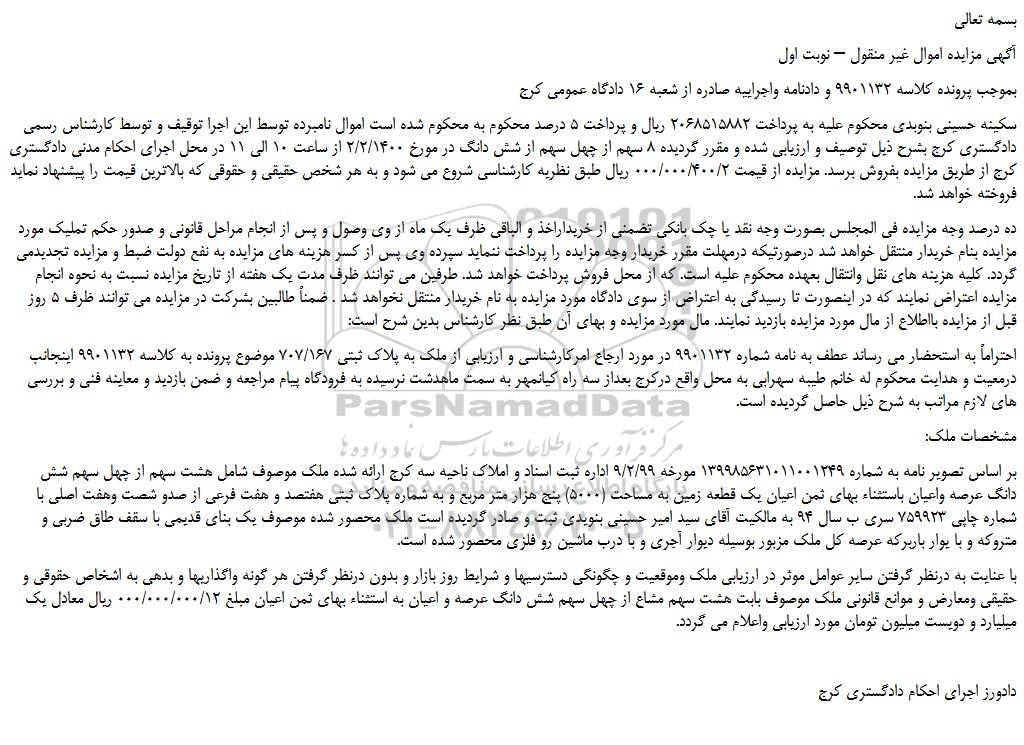 سکینه حسینی بنوبدی محکوم علیه به پرداخت 2068515882 ریال و پرداخت 5 درصد محکوم به محکوم شده است اموال نامبرده توسط این اجرا توقیف و توسط کارشناس رسمی دادگستری کرج بشرح ذیل توصیف و ارزیابی شده و مقرر گردیده 8 سهم از چهل سهم از شش دانگ در مورخ 2/2/1400 از ساعت 10 الی 11 در محل اجرای احکام مدنی دادگستری کرج از طریق مزایده بفروش برسد. مزایده از قیمت 000/000/400/2 ریال طبق نظریه کارشناسی شروع می شود و به هر شخص حقیقی و حقوقی که بالاترین قیمت را پیشنهاد نماید فروخته خواهد شد.