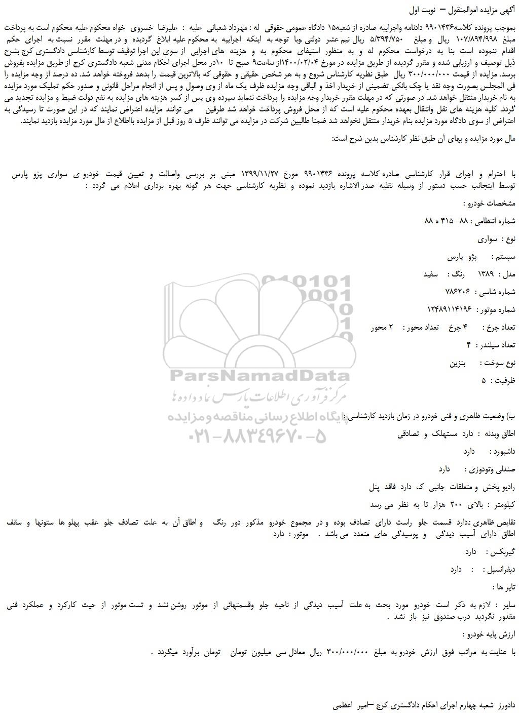 بموجب پرونده کلاسه9901436 دادنامه واجراییه صادره از شعبه15 دادگاه عمومی حقوقی  له : مهرداد شعبانی  علیه  :  علیرضا  خسروی  خواه محکوم علیه محکوم است به پرداخت مبلغ  107/894/998  ریال  و مبلغ    5/394/750  ریال نیم عشر  دولتی .وبا  توجه به  اینکه  اجراییه  به محکوم علیه ابلاغ  گردیده  و در مهلت  مقرر  نسبت به  اجرای  حکم  اقدام  ننموده  است  بنا  به  درخواست  محکوم  له  و  به  منظور  استیفای  محکوم  به  و  هزینه  های اجرایی  از سوی این اجرا توقیف توسط کارشناسی دادگستری کرج بشرح ذیل توصیف و ارزیابی شده و مقرر گردیده از طریق مزایده در مورخ 1400/02/04از ساعت9 صبح تا  10در محل اجرای احکام مدنی شعبه دادگستری کرج از طریق مزایده بفروش برسد. مزایده از قیمت 300/000/000 ریال  طبق نظریه کارشناس شروع و به هر شخص حقیقی و حقوقی که بالاترین قیمت را بدهد فروخته خواهد شد. ده درصد از وجه مزایده را فی المجلس بصورت وجه نقد یا چک بانکی تضمینی از خریدار اخذ و الباقی وجه مزایده ظرف یک ماه از وی وصول و پس از انجام مراحل قانونی و صدور حکم تملیک مورد مزایده به نام خریدار منتقل خواهد شد. در صورتی که در مهلت مقرر خریدار وجه مزایده را پرداخت ننماید سپرده وی پس از کسر هزینه های مزایده به نفع دولت ضبط و مزایده تجدید می گردد. کلیه هزینه های نقل وانتقال بعهده محکوم علیه است که از محل فروش پرداخت خواهد شد طرفین    می توانند مزایده اعتراض نمایند که در این صورت تا رسیدگی به اعتراض از سوی دادگاه مورد مزایده بنام خریدار منتقل نخواهد شد ضمنا طالبین شرکت در مزایده می توانند ظرف 5 روز قبل از مزایده بااطلاع از مال مورد مزایده بازدید نمایند.