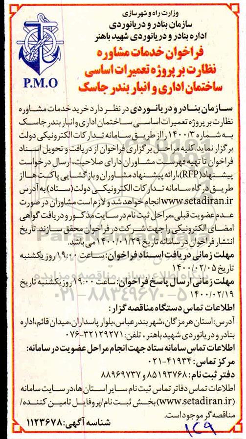 سازمان بنادر و دریانوردی در نظر دارد خرید خدمات مشاوره نظارت بر پروژه تعمیرات اساسی ساختمان اداری و انبار بندر جاسک به شماره 1400/3 را از طریق سامانه تدارکات الکترونیکی دولت برگزار نماید کلیه مراحل برگزاری فراخوان از دریافت و تحویل اسناد فراخوان تا تهیه فهرست مشاوران دارای صلاحیت ارسال درخواست پیشنهاد RFP ارائه پیشنهاد مشاوران و بازگشایی پاکتها از طریق درگاه سامانه تدارکات الکترونیکی دولت ستاد به آدرس ستاد انجام خواهد شد و لازم است مشاوران در صورت عدم عضویت قبلی مراحل ثبت نام در سایت مذکور و دریافت گواهی امضای الکترونیکی را جهت شرکت در فراخوان محقق سازند.