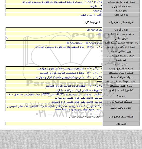 مناقصه عمومی یک مرحله ای ۹۹/۴۲خمل MTBEاز بندر ماهشهر به محل سایت شرکت پالایش نفت امام خمینی ره شازند