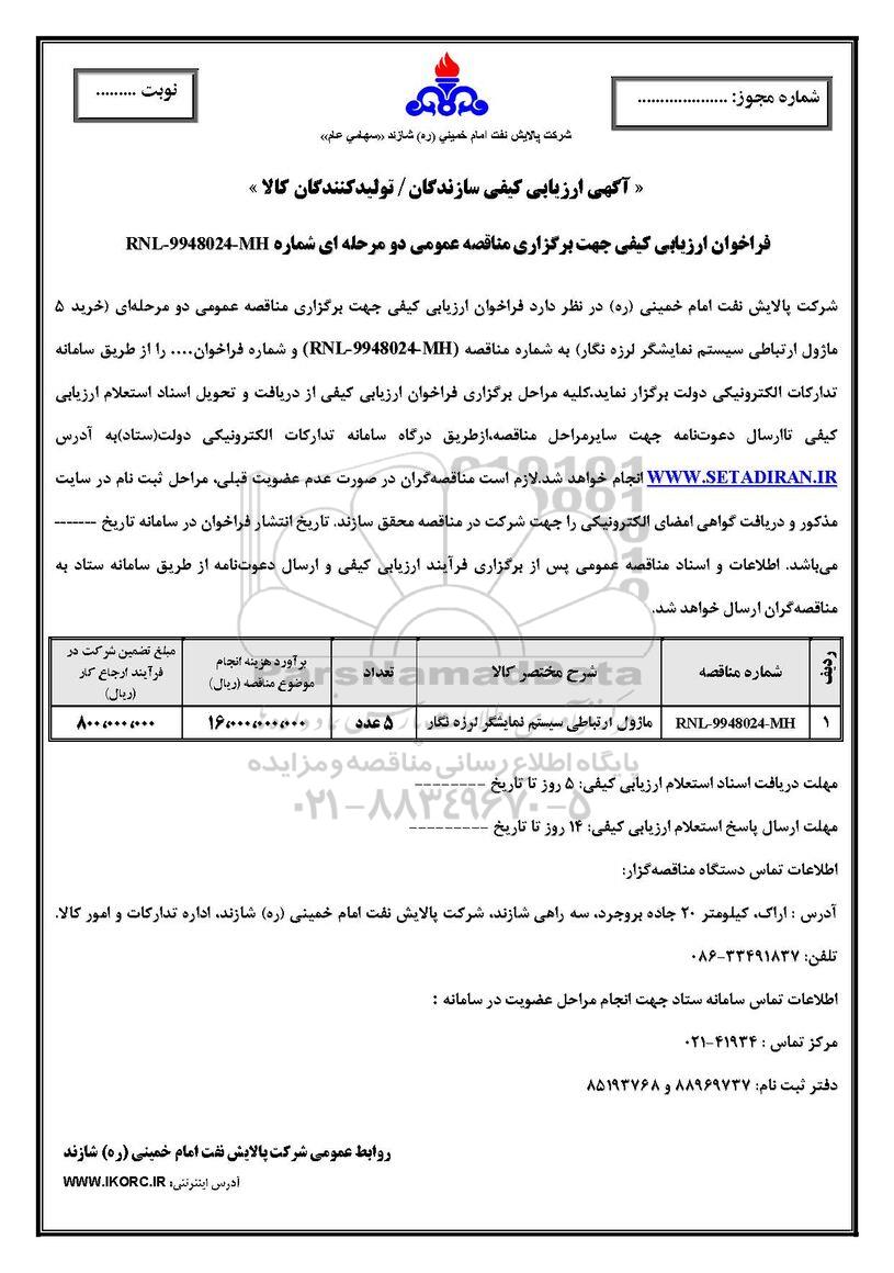 شرکت پالایش نفت امام خمینی (ره) شازند در نظر دارد فراخوان ارزیابی کیفی جهت برگزاری مناقصه عمومی دو مرحله ای (خرید 5 ماژول ارتباطی سیستم نمایشگر لرزه نگار) به شماره مناقصه (شماره RNL - 9948024 - MH) و شماره فراخوان ... را از طریق سامانه تدارکات الکترونیکی دولت برگزار نماید. کلیه مراحل برگزاری فراخوان ارزیابی کیفی از دریافت و تحویل اسناد استعلام ارزیابی کیفی تا ارسال دعوتنامه جهت سایر مراحل مناقصه از طریق درگاه سامانه تدارکات الکترونیکی دولت ستاد به آدرس ستاد ایران انجام خواهد شد. لازم است مناقصه گران در صورت عدم عضویت قبلی مراحل ثبت نام در سایت مذکور و دریافت گواهی امضای الکترونیکی را جهت شرکت در مناقصه محقق سازند. تاریخ انتشار فراخوان در سامانه تاریخ ... می باشد. اطلاعات و اسناد مناقصه عمومی پس از برگزاری فرآیند ارزیایبی کیفی و ارسال دعوتنامه از طریق سامانه ستاد به مناقصه گران ارسال خواهد شد.