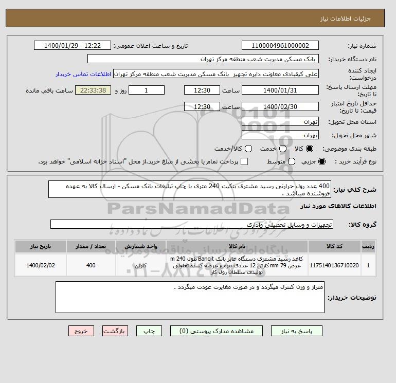 شرح کلی نیاز: 400 عدد رول حرارتی رسید مشتری بنکیت 240 متری با چاپ تبلیغات بانک مسکن - ارسال کالا به عهده فروشنده میباشد .