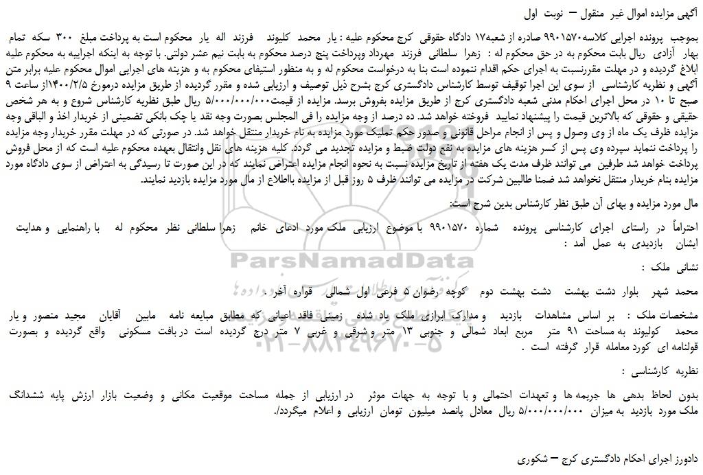 بموجب پرونده اجرایی کلاسه9901570 صادره از شعبه17 دادگاه حقوقی کرج محکوم علیه : یار محمد کلیوند فرزند اله یار محکوم است به پرداخت مبلغ 300 سکه تمام بهار آزادی ریال بابت محکوم به در حق محکوم له : زهرا سلطانی فرزند مهرداد وپرداخت پنج درصد محکوم به بابت نیم عشر دولتی. با توجه به اینکه اجراییه به محکوم علیه ابلاغ گردیده و در مهلت مقررنسبت به اجرای حکم اقدام ننموده است بنا به درخواست محکوم له و به منظور استیفای محکوم به و هزینه های اجرایی اموال محکوم علیه برابر متن آگهی و نظریه کارشناسی از سوی این اجرا توقیف توسط کارشناس دادگستری کرج بشرح ذیل توصیف و ارزیابی شده و مقرر گردیده از طریق مزایده درمورخ 1400/2/5از ساعت 9 صبح تا 10 در محل اجرای احکام مدنی شعبه دادگستری کرج از طریق مزایده بفروش برسد. مزایده از قیمت5/000/000/000 ریال طبق نظریه کارشناس شروع و به هر شخص حقیقی و حقوقی که بالاترین قیمت را پیشنهاد نمایید فروخته خواهد شد. ده درصد از وجه مزایده را فی المجلس بصورت وجه نقد یا چک بانکی تضمینی از خریدار اخذ و الباقی وجه مزایده ظرف یک ماه از وی وصول و پس از انجام مراحل قانونی و صدور حکم تملیک مورد مزایده به نام خریدار منتقل خواهد شد. در صورتی که در مهلت مقرر خریدار وجه مزایده را پرداخت ننماید سپرده وی پس از کسر هزینه های مزایده به نفع دولت ضبط و مزایده تجدید می گردد. کلیه هزینه های نقل وانتقال بعهده محکوم علیه است که از محل فروش پرداخت خواهد شد طرفین می توانند ظرف مدت یک هفته از تاریخ مزایده نسبت به نحوه انجام مزایده اعتراض نمایند که در این صورت تا رسیدگی به اعتراض از سوی دادگاه مورد مزایده بنام خریدار منتقل نخواهد شد ضمنا طالبین شرکت در مزایده می توانند ظرف 5 روز قبل از مزایده بااطلاع از مال مورد مزایده بازدید نمایند.