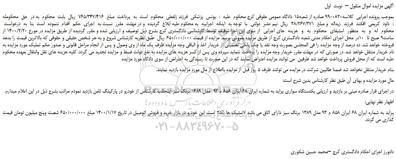 بموجب پرونده اجرایی  کلاسه9900820 صادره از شعبه15 دادگاه عمومی حقوقی کرج محکوم  علیه  :  یونس  پزشکی  فرزند زلفعلی  محکوم  است  به  پرداخت  مبلغ  765/347/416  ریال  بابت  محکوم  به در  حق  محکومله :  داود  کریمی  اقکند  فرزند  زیداله  و مبلغ  38/267/371  ریال  نیم عشر  دولتی  .با  توجه به  اینکه  اجراییه  به محکوم علیه ابلاغ  گردیده  و در مهلت  مقرر  نسبت به  اجرای  حکم  اقدام  ننموده  است  بنا  به  درخواست  محکوم  له  و  به  منظور  استیفای  محکوم  به  و  هزینه  های اجرایی  از سوی این اجرا توقیف توسط کارشناسی دادگستری کرج بشرح ذیل توصیف و ارزیابی شده و مقرر گردیده از طریق مزایده در مورخ 1400/2/20 از ساعت9 صبح تا  10در محل اجرای احکام مدنی شعبه دادگستری کرج از طریق مزایده بفروش برسد. مزایده از قیمت 650/000/000 ریال  طبق نظریه کارشناس شروع و به هر شخص حقیقی و حقوقی که بالاترین قیمت را بدهد فروخته خواهد شد. ده درصد از وجه مزایده را فی المجلس بصورت وجه نقد یا چک بانکی تضمینی از خریدار اخذ و الباقی وجه مزایده ظرف یک ماه از وی وصول و پس از انجام مراحل قانونی و صدور حکم تملیک مورد مزایده به نام خریدار منتقل خواهد شد. در صورتی که در مهلت مقرر خریدار وجه مزایده را پرداخت ننماید سپرده وی پس از کسر هزینه های مزایده به نفع دولت ضبط و مزایده تجدید می گردد. کلیه هزینه های نقل وانتقال بعهده محکوم علیه است که از محل فروش پرداخت خواهد شد طرفین  می توانند مزایده اعتراض نمایند که در این صورت تا رسیدگی به اعتراض از سوی دادگاه مورد مزایده