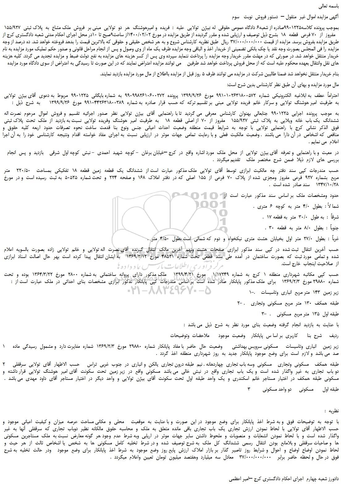 بموجب پرونده کلاسه9901225صادره از شعبه6 دادگاه عمومی حقوقی له :بیژن تولایی علیه : فریده و امیرهوشنگ هر دو تولایی مبنی بر فروش ملک مشاع به پلاک ثبتی 155/927 مفروز از 70 فرعی قطعه 18 بشرح ذیل توصیف و ارزیابی شده و مقرر گردیده از طریق مزایده در مورخ 1400/02/02از ساعت9صبح تا 10در محل اجرای احکام مدنی شعبه دادگستری کرج از طریق مزایده بفروش برسد. مزایده از قیمت 37/000/000/000 ریال طبق نظریه کارشناس شروع و به هر شخص حقیقی و حقوقی که بالاترین قیمت را بدهد فروخته خواهد شد. ده درصد از وجه مزایده را فی المجلس بصورت وجه نقد یا چک بانکی تضمینی از خریدار اخذ و الباقی وجه مزایده ظرف یک ماه از وی وصول و پس از انجام مراحل قانونی و صدور حکم تملیک مورد مزایده به نام خریدار منتقل خواهد شد. در صورتی که در مهلت مقرر خریدار وجه مزایده را پرداخت ننماید سپرده وی پس از کسر هزینه های مزایده به نفع دولت ضبط و مزایده تجدید می گردد. کلیه هزینه های نقل وانتقال بعهده محکوم علیه است که از محل فروش پرداخت خواهد شد طرفین می توانند مزایده اعتراض نمایند که در این صورت تا رسیدگی به اعتراض از سوی دادگاه مورد مزایده