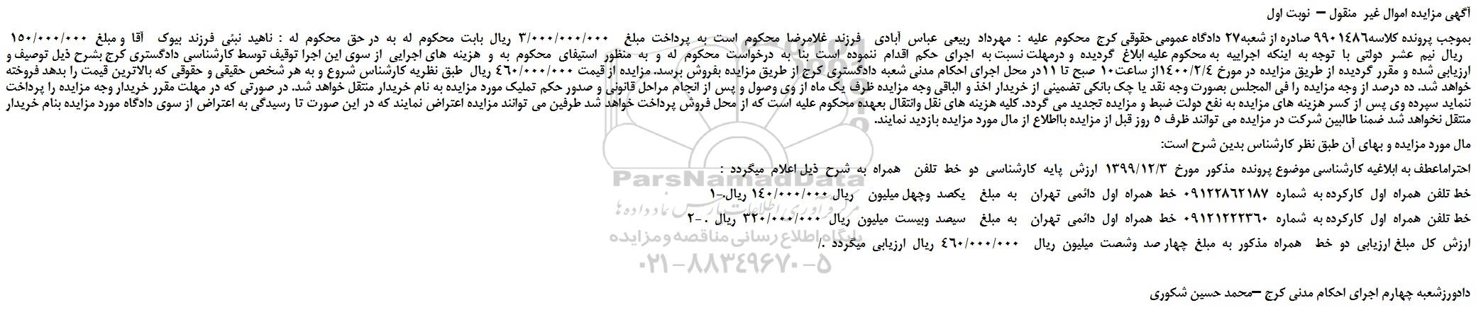 بموجب پرونده کلاسه9901486 صادره از شعبه27 دادگاه عمومی حقوقی کرج محکوم علیه : مهرداد ربیعی عباس آبادی فرزند غلامرضا محکوم است به پرداخت مبلغ 3/000/000/000 ریال بابت محکوم له به در حق محکوم له : ناهید نبئی فرزند بیوک آقا و مبلغ 150/000/000 ریال نیم عشر دولتی با توجه به اینکه اجراییه به محکوم علیه ابلاغ گردیده و درمهلت نسبت به اجرای حکم اقدام ننموده است بنا به درخواست محکوم له و به منظور استیفای محکوم به و هزینه های اجرایی از سوی این اجرا توقیف توسط کارشناسی دادگستری کرج بشرح ذیل توصیف و ارزیابی شده و مقرر گردیده از طریق مزایده در مورخ 1400/2/4از ساعت10 صبح تا 11در محل اجرای احکام مدنی شعبه دادگستری کرج از طریق مزایده بفروش برسد. مزایده از قیمت 460/000/000 ریال طبق نظریه کارشناس شروع و به هر شخص حقیقی و حقوقی که بالاترین قیمت را بدهد فروخته خواهد شد. ده درصد از وجه مزایده را فی المجلس بصورت وجه نقد یا چک بانکی تضمینی از خریدار اخذ و الباقی وجه مزایده ظرف یک ماه از وی وصول و پس از انجام مراحل قانونی و صدور حکم تملیک مورد مزایده به نام خریدار منتقل خواهد شد. در صورتی که در مهلت مقرر خریدار وجه مزایده را پرداخت ننماید سپرده وی پس از کسر هزینه های مزایده به نفع دولت ضبط و مزایده تجدید می گردد. کلیه هزینه های نقل وانتقال بعهده محکوم علیه است که از محل فروش پرداخت خواهد شد طرفین می توانند مزایده اعتراض نمایند که در این صورت تا رسیدگی به اعتراض از سوی دادگاه مورد مزایده بنام خریدار منتقل نخواهد شد ضمنا طالبین شرکت در مزایده می توانند ظرف 5 روز قبل از مزایده بااطلاع از مال مورد مزایده بازدید نمایند.