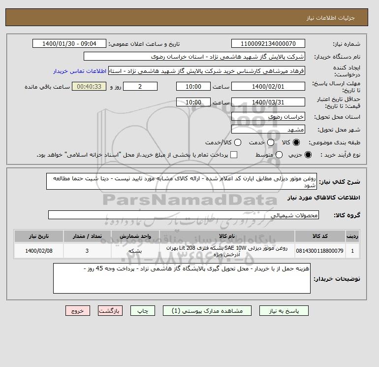 استعلام روغن موتور دیزلی مطابق ایارن کد اعلام شده - ارائه کالای مشابه مورد تایید نیست - دیتا شیت حتما مطالعه شود, استعلام روغن موتور دیزلی مطابق ایارن کد اعلام شده - ارائه کالای مشابه مورد تایید نیست - دیتا شیت حتما مطالعه شود