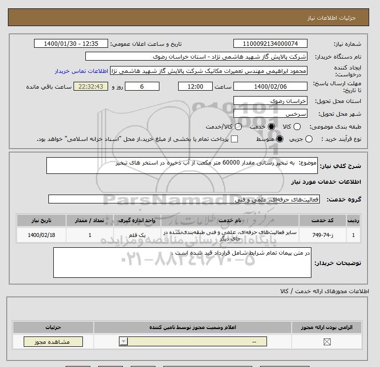 نام دستگاه خریدار:شرکت پالایش گاز شهید هاشمی نژاد - استان خراسان رضوی