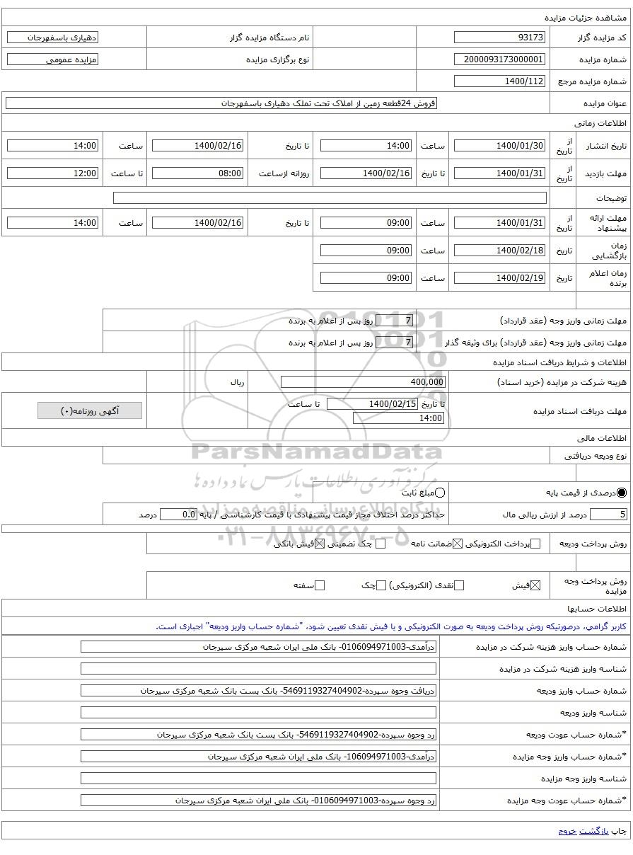 | عنوان مزایده | فروش 24قطعه زمین از املاک تحت تملک دهیاری باسفهرجان | |||