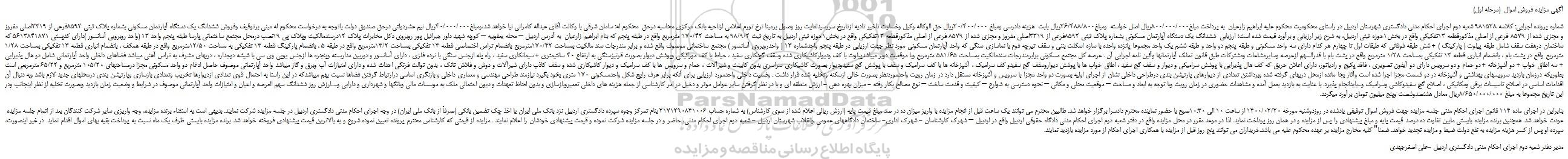 بنابراین در اجرای ماده 114 قانون اجرای احکام مدنی جلسه مزایده جهت فروش اموال توقیفی یادشده در روزدوشنبه مورخه 1400/02/20 از ساعت 10 الی 10:30صبح با حضور نماینده محترم دادسرا برگزار خواهد شد. طالبین محترم می توانند یک ساعت قبل از انجام مزایده با واریز میزان ده در صد مبلغ قیمت پایه (ارزش ریالی اعلام شده از سوی کارشناس) به شماره حساب 2171290841006 بنام تمرکز وجوه سپرده دادگستری اردبیل نزد بانک ملی ایران یا اخذ چک تضمین بانکی (صرفاً از بانک ملی ایران) در وجه اجرای احکام مدنی دادگستری اردبیل در جلسه مزایده شرکت نمایند. بدیهی است به استثناء برنده مزایده، وجه واریزی سایر شرکت کنندگان بعد از اتمام جلسه مزایده عودت خواهد شد. همچنین برنده مزایده بایستی مابین تفاوت ده درصد قیمت پایه و مبلغ پیشنهادی را پس از مزایده و در همان روز پرداخت نماید. لذا در موعد مقرر در محل مزایده واقع در دفتر شعبه دوم اجرای احکام مدنی دادگاه حقوقی اردبیل واقع در اردبیل – شهرک کارشناسان - شهرک اداری- ساختمان دادگاههای عمومی وانقلاب شهرستان اردبیل - شعبه دوم اجرای احکام مدنی، حاضر و در جلسه مزایده شرکت نموده و قیمت پیشنهادی خودشان را اعلام نمایند . مزایده از قیمتی که کارشناس محترم پرونده تعیین نموده شروع و به بالاترین قیمت پیشنهادی فروخته خواهد شد. برنده مزایده بایستی ظرف یک ماه نسبت به پرداخت بقیه بهای اموال اقدام نماید در غیر اینصورت، سپرده او پس از کسر هزینه مزایده به نفع دولت ضبط و مزایده تجدید خواهد. ضمنا" کلیه مخارج مزایده بر عهده محکوم علیه می باشد.خریداران می توانند پنج روز قبل از مزایده با همکاری اجرای احکام از مورد مزایده بازدید نمایند.
