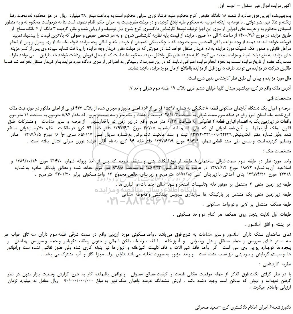 بموجبپرونده اجرایی فوق صادره از شعبه 18 دادگاه حقوقی  کرج محکوم علیه: فرشاد نوری سرابی محکوم است به پرداخت مبلغ  38 میلیارد  ریال  در حق محکوم له: محمد رضا زنگنه و 5%  نیم عشر دولتی . با توجه به اینکه اجراییه به محکوم علیه ابلاغ گردیده و در مهلت مقررنسبت به اجرای حکم اقدام ننموده است بنا به درخواست محکوم له و به منظور استیفای محکوم به و هزینه های اجرایی از سوی این اجرا توقیف توسط کارشناس دادگستری کرج بشرح ذیل توصیف و ارزیابی شده و مقرر گردیده 3 دانگ از 6 دانگ مشاع  از طریق مزایده در مورخ 1400/2/6 از ساعت 9 الی 10 صبح . مزایده از قیمت پایه نظریه کارشناسی شروع  و به هر شخص حقیقی و حقوقی که بالاترین قیمت را پیشنهاد نمایید  فروخته خواهد شد. ده درصد از وجه مزایده را فی المجلس بصورت وجه نقد یا چک بانکی تضمینی از خریدار اخذ و الباقی وجه مزایده ظرف یک ماه از وی وصول و پس از انجام مراحل قانونی و صدور حکم تملیک مورد مزایده به نام خریدار منتقل خواهد شد. در صورتی که در مهلت مقرر خریدار وجه مزایده را پرداخت ننماید سپرده وی پس از کسر هزینه های مزایده به نفع دولت ضبط و مزایده تجدید می گردد. کلیه هزینه های نقل وانتقال بعهده محکوم علیه است که از محل فروش پرداخت خواهد شد طرفین    می توانند ظرف مدت یک هفته از تاریخ مزایده نسبت به نحوه انجام مزایده اعتراض نمایند که در این صورت تا رسیدگی به اعتراض از سوی دادگاه مورد مزایده بنام خریدار منتقل نخواهد شد ضمنا طالبین شرکت در مزایده می توانند ظرف 5 روز قبل از مزایده بااطلاع از مال مورد مزایده بازدید نمایند.