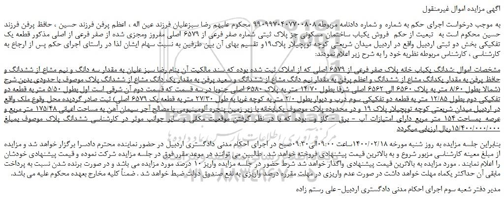 به موجب درخواست اجرای حکم به شماره و شماره دادنامه مربوطه 9909970407700808 محکوم علیهم رضا سبزعلیان فرزند عین اله ، اعظم پرفن فرزند حسین ، حافظ پرفن فرزند حسین محکوم است به تبعیت از حکم فروش یکباب ساختمان مسکونی جز پلاک ثبتی شماره صفر فرعی از 6579 اصلی مفروز ومجزی شده از صفر فرعی از اصلی مذکور قطعه یک تفکیکی بخش دو ثبتی اردبیل واقع در اردبیل میدان شریعتی کوچه توپچیلار پلاک19و تقسیم بهای آن بین طرفین به نسبت سهام ایشان لذا در راستای اجرای حکم پس از ارجاع به کارشناسی ، کارشناس مربوطه نظریه خود را به شرح زیر اعلام نمودند: