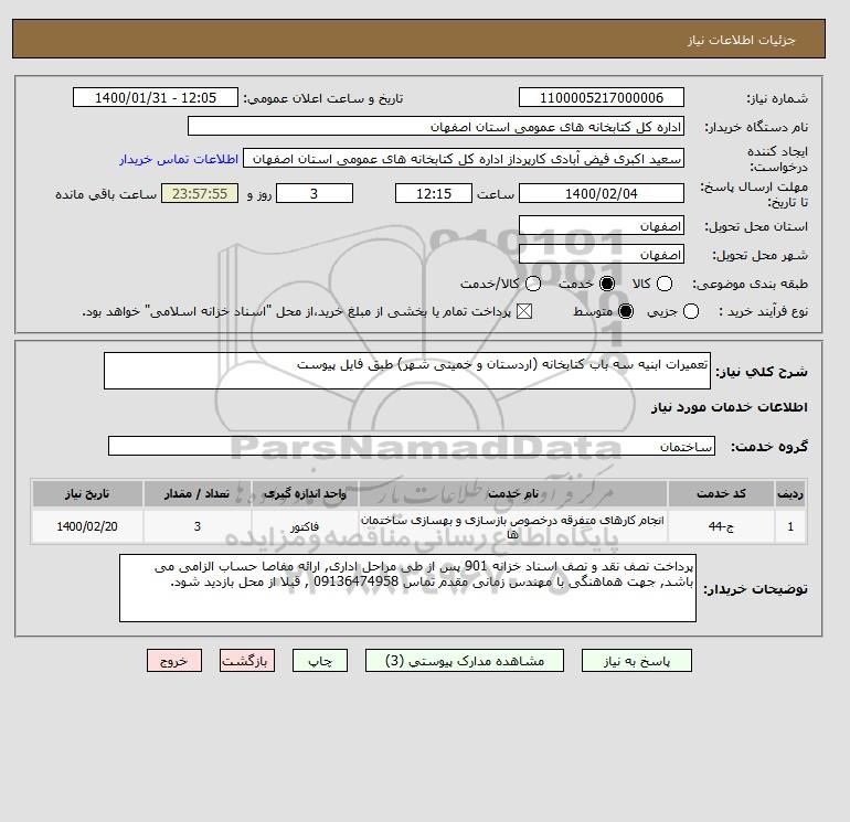 شرح کلی نیاز: تعمیرات ابنیه سه باب کتابخانه (اردستان و خمینی شهر) طبق فایل پیوست