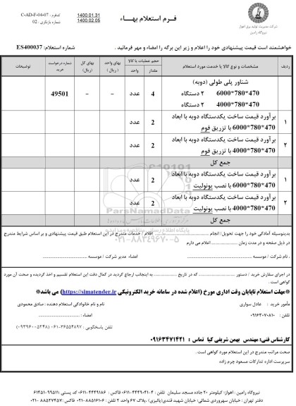 | 2 | برآورد قیمت ساخت یکدستگاه دوبه با ابعاد 470 * 780 * 4000 با نصب یونولیت | 2 | عدد | |