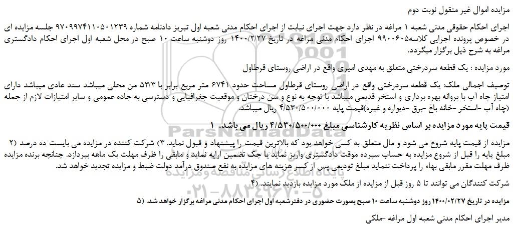 اجرای احکام حقوقی مدنی شعبه 1 مراغه در نظر دارد جهت اجرای نیابت از اجرای احکام مدنی شعبه اول تبریز دادنامه شماره 9709974110501239 جلسه مزایده ای در خصوص پرونده اجرایی کلاسه9900605 اجرای احکام مدنی مراغه در تاریخ 1400/2/27 روز دوشنبه ساعت 10 صبح در محل شعبه اول اجرای احکام دادگستری مراغه به شرح ذیل برگزار میگردد.