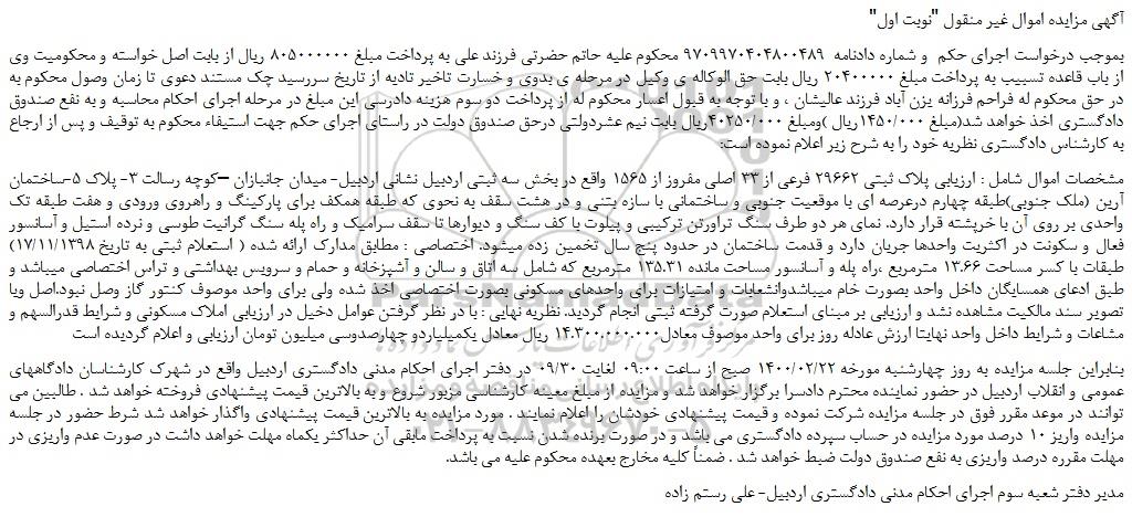 "آگهی مزایده اموال غیر منقول "نوبت اول