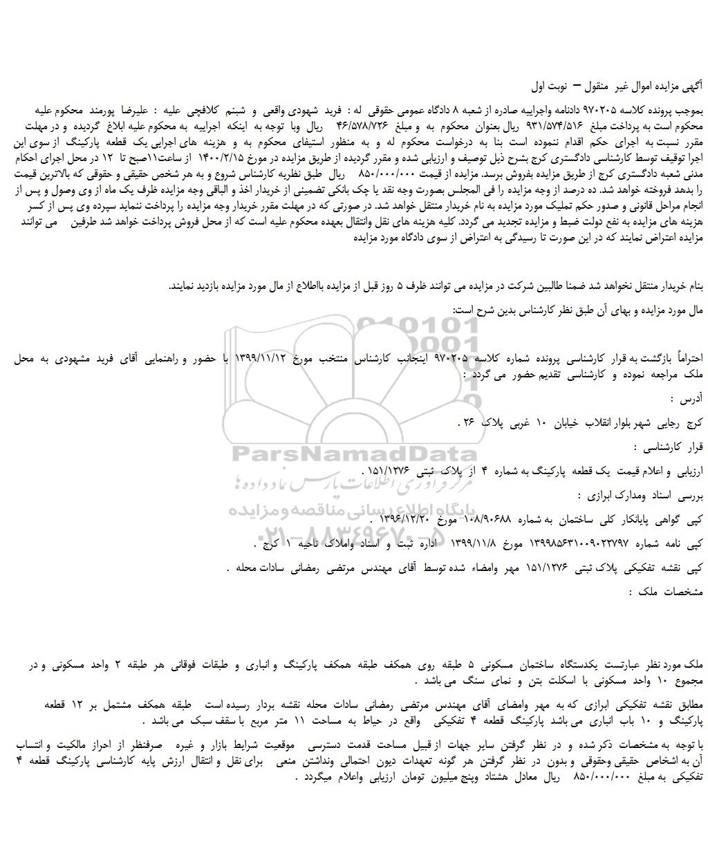بموجب پرونده کلاسه 970205 دادنامه واجراییه صادره از شعبه 8 دادگاه عمومی حقوقی له : فرید شهودی واقعی و شبنم کلافچی علیه : علیرضا پورمند محکوم علیه محکوم است به پرداخت مبلغ 931/574/516 ریال بعنوان محکوم به و مبلغ 46/578/726 ریال وبا توجه به اینکه اجراییه به محکوم علیه ابلاغ گردیده و در مهلت مقرر نسبت به اجرای حکم اقدام ننموده است بنا به درخواست محکوم له و به منظور استیفای محکوم به و هزینه های اجرایی یک قطعه پارکینگ از سوی این اجرا توقیف توسط کارشناسی دادگستری کرج بشرح ذیل توصیف و ارزیابی شده و مقرر گردیده از طریق مزایده در مورخ 1400/2/15 از ساعت11صبح تا 12 در محل اجرای احکام مدنی شعبه دادگستری کرج از طریق مزایده بفروش برسد. مزایده از قیمت 850/000/000 ریال طبق نظریه کارشناس شروع و به هر شخص حقیقی و حقوقی که بالاترین قیمت را بدهد فروخته خواهد شد. ده درصد از وجه مزایده را فی المجلس بصورت وجه نقد یا چک بانکی تضمینی از خریدار اخذ و الباقی وجه مزایده ظرف یک ماه از وی وصول و پس از انجام مراحل قانونی و صدور حکم تملیک مورد مزایده به نام خریدار منتقل خواهد شد. در صورتی که در مهلت مقرر خریدار وجه مزایده را پرداخت ننماید سپرده وی پس از کسر هزینه های مزایده به نفع دولت ضبط و مزایده تجدید می گردد. کلیه هزینه های نقل وانتقال بعهده محکوم علیه است که از محل فروش پرداخت خواهد شد طرفین می توانند مزایده اعتراض نمایند که در این صورت تا رسیدگی به اعتراض از سوی دادگاه مورد مزایده