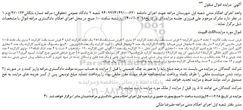 واحد اجرای احکام مدنی شعبه اول شهرستان مراغه جهت اجرای دادنامه 9409974149100630 شعبه 2 دادگاه عمومی (حقوقی) مراغه شماره بایگانی970136/ج.م 1 در نظر دارد ماترک مرحوم علی فیروزی جلسه مزایده ای در تاریخ18/ 02/ 1400 روزشنبه ساعت 10 صبح در محل اجرای احکام دادگستری مراغه اموال با مشخصات ذیل برگزار نماید .